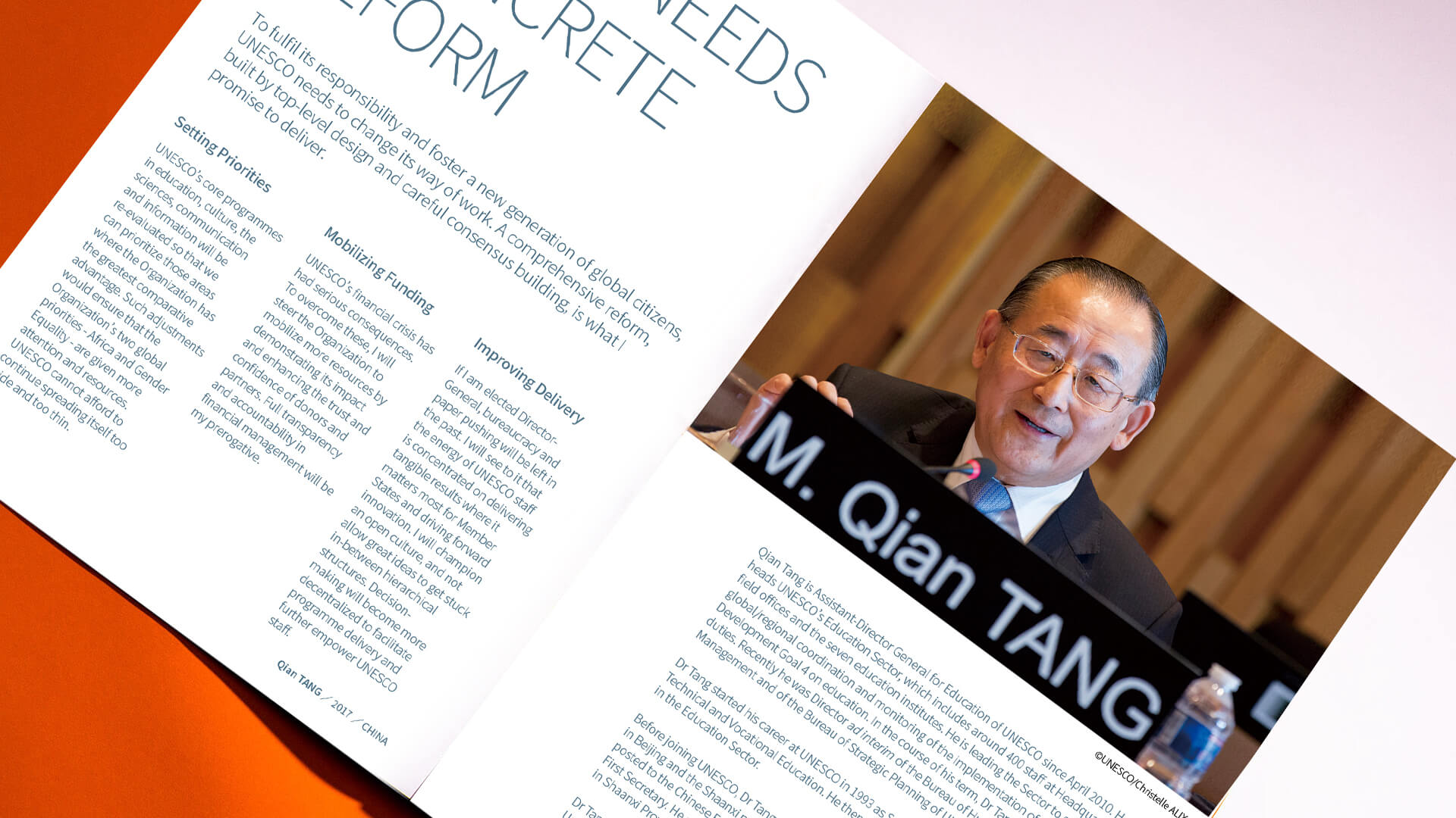 客户挑战:2017年3月,唐虔被正式提名为联合国教科文组织总干事中国的候选人,竞选将在2017年10月30日至11月14日召开的联合国教科文组织大会中举行。在举行之前,我有幸跟唐先生在北京民族饭店逐步探讨了竞选对手的特征、唐先生的竞争优势和个性特点,希望能够在竞选材料中,以独特的面貌脱颖而出,但又不张扬。
